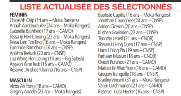 Selon François Lan Kwet Hian, président de la FMN, Alicia a été contrainte de se retirer de la sélection des JIOI 2023 en raison de problèmes de santé. Par conséquent, la fédération a pris la décision qu’Eunnice Ramdhun et Tessa Lam Tze Ting nagent à sa place. La sélection se retrouve donc maintenant avec neuf nageuses et 15 nageurs. Pour le moment, Anshee Khanna chez les filles et Luca Hecker chez les garçons font office de réserves au cas où il y aurait d’autres désistements.