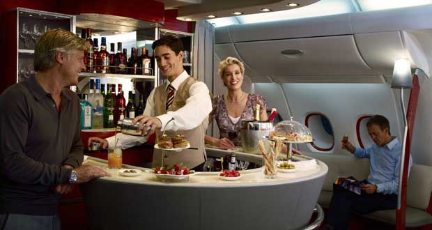 Les chaussures enlevées, j’ajuste mon siège, disposant de plusieurs options, à la position idéale. En un simple mouvement je le bascule en lit et m’allonge quelques secondes pour me remettre de mes émotions, qui venaient tout juste de commencer. Néanmoins, me dis-je, «il faut profiter pleinement de cet instant.» Je décide alors de poursuivre ma visite qui me mène jusqu’au… «lounge». Equipé d’un bar, le salon, qui est l’un des atouts principal de l’A 380 et disponible en première classe et en classe affaires, est un espace de rencontre. La bonne humeur est au rendez-vous.