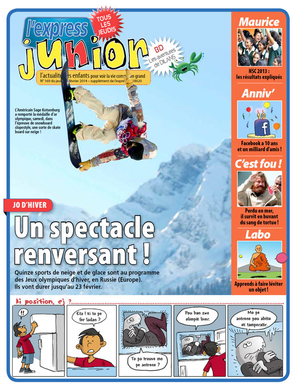 l’express junior est un supplément gratuit de l’express. C’est le seul journal mauricien pour enfants (8-13 ans). Tous les jeudis, c’est 8 pages en couleurs et des rubriques comme celles qu’on lit dans le journal des parents. Pour s’informer, comprendre… et grandir !