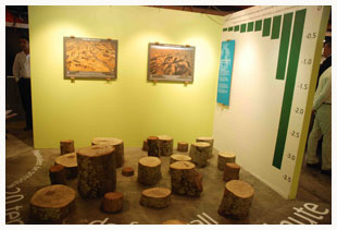 Chacune des touches de l’orgue nous informe de la même façon sur les sources d’énergies générées par divers objets, comme le soleil. Çà et là, des applications de l’organisation LAMAP affichent, entre autres, des animations interactives et des questionnaires autour du changement climatique ou du niveau annuel de carbone émis dans le monde. De petites installations sous forme de troncs d’arbre ont été aménagées pour un aperçu visuel de la déforestation (photo). En bas, sur le sol, tout autour des mini troncs d’arbres, une inscription dans une typographie amusante apporte quelques précisions relatives au nombre de forêts disparaissant dans le monde au fil des trente dernières années à peu près.