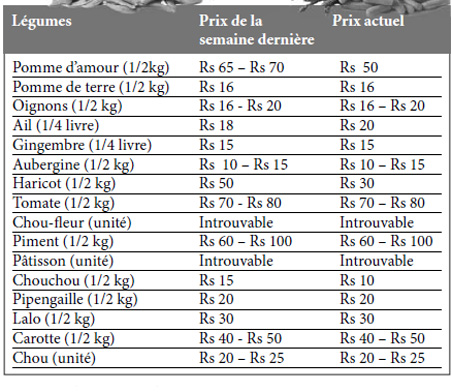 Par contre, l’ail a enregistré une hausse et se vend à Rs 20 (1/4 livre) contre Rs 18 la semaine dernière.