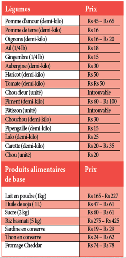 La pomme d’amour continue sur sa lancée : cette semaine encore, le prix maximal augmente de Rs 5, passant de Rs 60 à Rs 65. Le demi-kilo de haricot passe quant à lui de Rs 30 à Rs 50, tandis que la livre de chouchou coûte Rs 5 de plus. Toutefois, une baisse de prix est constatée en ce qui concerne le lalo et le pipengaille. Pas de changement du côté des produits alimentaires de base.