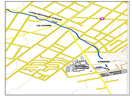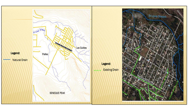 •Figures 1.2 and 1.3 respectively, show how unplanned infrastructural development at Pailles, Les Guibies has perverted the natural course of water. Figure 1.2 locates the erstwhile natural drain amidst sugar plantations. Rainwater absorbed by the soil ran through these natural watercourses. However, as demonstrated by the contrasting figure 1.3, unplanned ad-hoc drains have replaced these natural watercourses. These have been built along the roads. It is also to be noted that these drains do not lead to any outlet for an eventual evacuation of water.