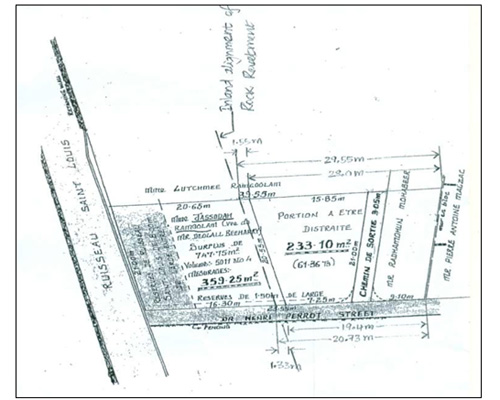 •In the particular case of Canal Dayot, in trying to please lobbies, the canal has been incapacitated to face situations of flooding. The natural breadth of Canal Dayot is 30m. However, land which formed part of the riverbed was sold off to individuals and only a reserve of 8 meters was retained to accommodate the canal water. However, recently, at the time of the reconstruction of the boundaries of Canal Dayot, the breath of the bed was extended to 18m, as authorities tried to strike a balance between safeguarding the private ownership of the adjacent properties and flood risk mitigation. Figure 1.5 shows the progressive modifications to the riverbed of Canal Dayot. It also points out the plots of land forming part of the riverbed which have been sold off to individuals.