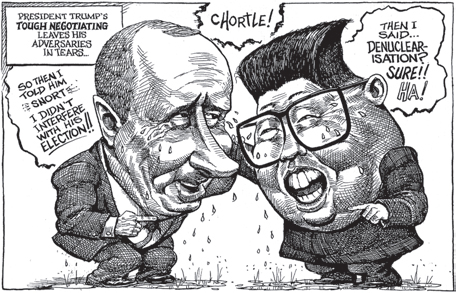 Lundi, Trump sera à Helsinki pour une réunion sans agenda aucun avec Poutine, l’homme que toutes les agences de sécurité des États-Unis, de même que la commission Mueller, accusent d’intervention massive dans les élections américaines, dont le comité olympique vient d’être banni des Jeux d’hiver depuis décembre 2017*, que les Britanniques accusent d’utiliser le Novichok pour tuer sur leur territoire, que les Européens accusent pour l’invasion de la Crimée et la déstabilisation de l’Ukraine. Après s’être achoppé avec le Mexique, le Canada, la Chine, l’Allemagne et le reste de l’Europe, cette réunion devrait être, comme celle avec Kim, une occasion de se détendre et de souligner ses satisfactions mutuelles, si ce n’est d’être généreux ?