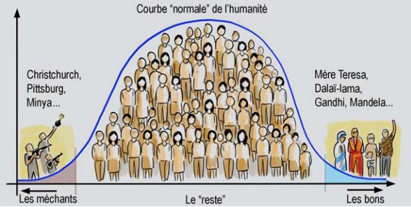 À la vérité, dans une population aussi étendue que celle des humains, soumis à une flopée de stress, de circonstances, d’influences, il n’est pas surprenant que tous ne finissent pas avec les mêmes choix et notamment les mêmes tendances civilisationnelles vers la paix. Encore heureux que le «mainstream» humain soit, lui, encore largement pacifique et solidement motivé pour trouver des compromis et des accommodements qui assurent l’harmonie ! Mais il est par ailleurs inévitable de trouver, comme dans toute courbe de Gauss de distribution normale, des «queues» de plus faible densité qui sont bien éloignées de la norme ! À une extrémité, les fabuleusement tolérants, les grands vertueux de ce monde comme Mère Theresa, Gandhi, Malala, Luther King ou le Dalaï-lama et à l’autre extrémité les radicaux étroits et intransigeants, imbus de leur seule «vérité» et qui sont disposés au pire, y compris au carnage, pour la démontrer à la face du monde. Parmi ceux-ci les individus plutôt isolés, s’appuyant parfois sur un miniréseau, les «lone wolves» qui règlent leurs comptes, en conduisant un camion dans une foule à Nice (2016, 86 morts), en sévissant dans une mosquée à Christchurch (2019, 50 morts) ou en massacrant des fidèles dans une synagogue de Pittsburg (2018, 11 morts) ou alors, ceux qui sont plus menaçants à long terme, c.-à-d., les mouvements organisés qui avec leurs charabias fondamentalistes et souvent violents, mobilisent l’émotionnel en utilisant des méthodes fascisantes et tentent de se draper de respectabilité et de s’installer durablement à la tête d’une nation.