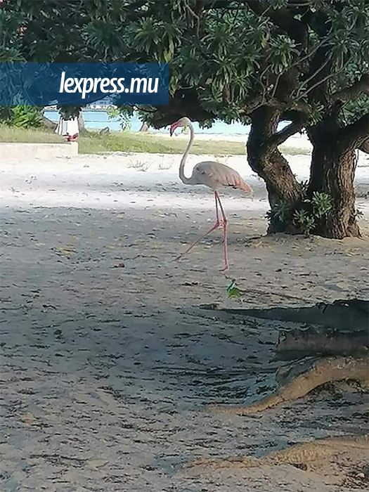 Ces images ont été prises, hier, lundi 5 avril, sur la plage déserte d'un hôtel à Wolmar. Il s'agit d'un flamant rose, un oiseau qui ne s'est pas posé de son propre gré à Maurice depuis les années 1770.